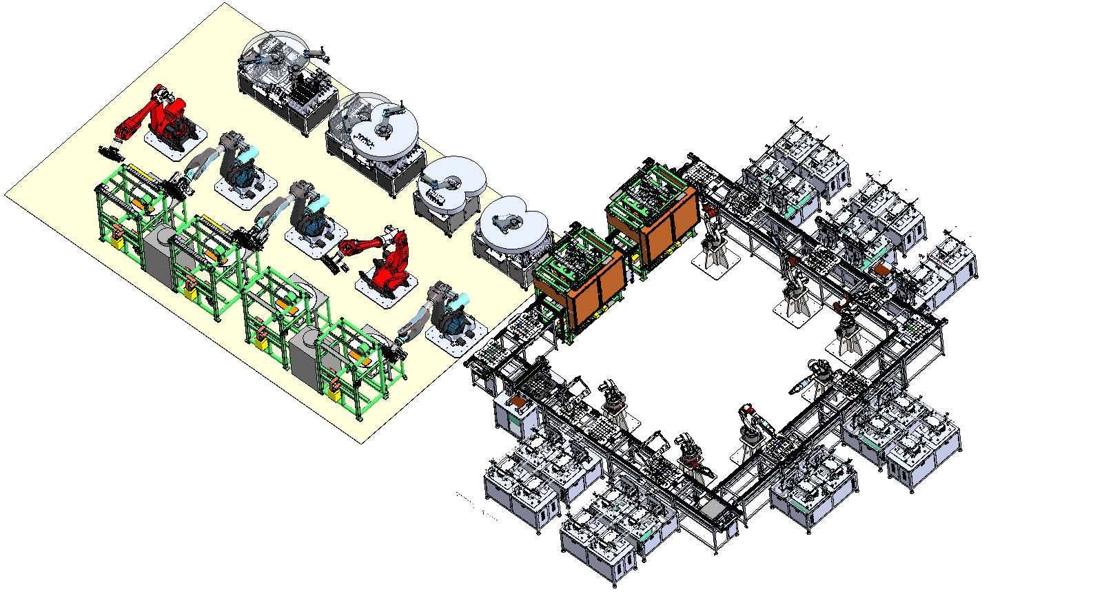 本生產(chǎn)線為洗碗機(jī)碗籃全自動(dòng)組合焊接線,主要由6臺(tái)自動(dòng)組合焊機(jī)、18臺(tái)工業(yè)機(jī)器人、17套儲(chǔ)送料裝置和運(yùn)行自檢系統(tǒng)組成。新型焊接機(jī)構(gòu)全面降低焊接耗材,工業(yè)機(jī)器人聯(lián)動(dòng)系統(tǒng)實(shí)現(xiàn)整線全自動(dòng)無人運(yùn)行,柔性化設(shè)計(jì)實(shí)現(xiàn)不限規(guī)格共線分時(shí)生產(chǎn),自檢測系統(tǒng)實(shí)現(xiàn)整線無憂運(yùn)行。